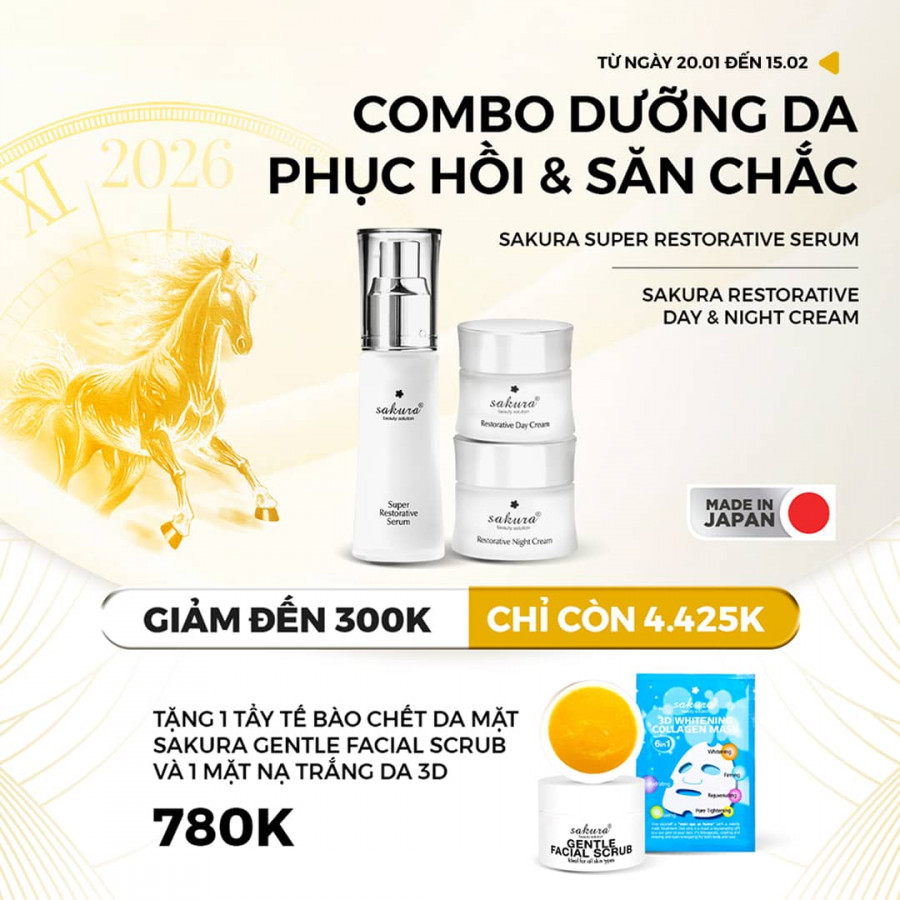 Sakura Restorative Collection là một trong những bộ sản phẩm được ưa chuộng bởi khả năng phục hồi tế bào thương tổn và làm trẻ hóa làn da tối ưu. Bên cạnh việc bổ sung các tinh chất từ thiên nhiên, Sakura Beauty chú trọng vào các thành phần đẩy mạnh sản sinh Collagen, dưỡng ẩm sâu để làn da thực sự khỏe mạnh.