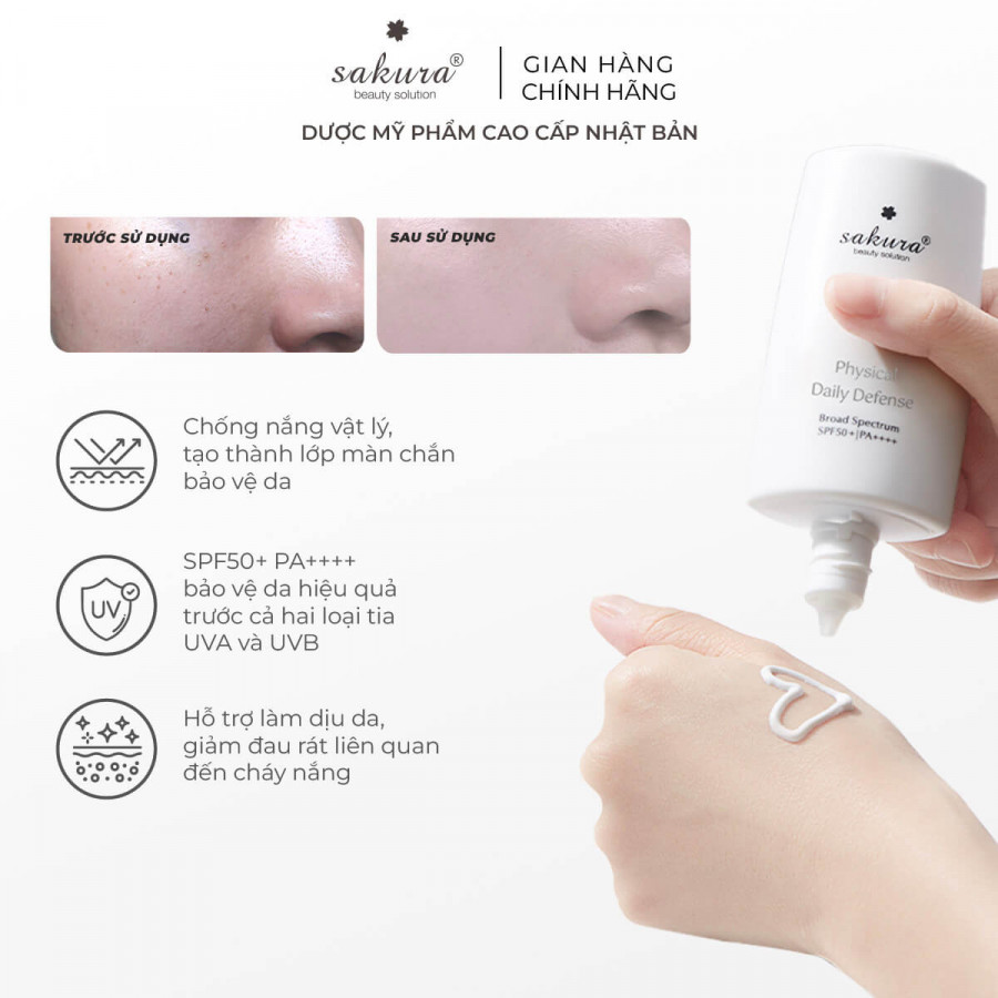 Nhũ tương chống nắng vật lý Sakura Physical Daily Defense SPF 50+ PA ++++ là Sản phẩm chống nắng vật lý với công thức dạng nhũ tương dịu nhẹ, hoàn toàn không chứa Silicon, dầu và cồn khoáng, Là giải pháp an toàn cho những ai muốn bảo vệ da khỏi ánh nắng mặt trời nhưng không muốn lưu lại lớp kem bao phủ dày và trắng bệt trên bề mặt da, điều này hoàn toàn khác biệt với các loại kem chống nắng và kem lót trang điểm khác.